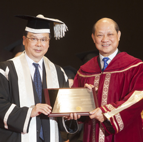 楊位醒先生, MH於2013年度畢業典禮上獲勞工及福利局局長張建宗先生, GBS, JP 頒授VTC榮譽院士榮銜