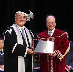 楊貫一先生, BBS, MH於2014年度畢業典禮上獲教育統籌委員會主席鄭慕智博士, GBS, OBE, JP頒授VTC榮譽院士榮銜