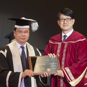 何懿德教授, PhD, MH於2013年度畢業典禮上獲勞工及福利局局長張建宗先生, GBS, JP 頒授VTC榮譽院士榮銜