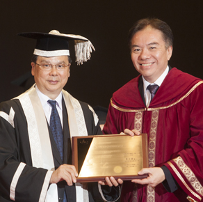 黃友嘉博士, BBS, JP於2013年度畢業典禮上獲勞工及福利局局長張建宗先生, GBS, JP 頒授VTC榮譽院士榮銜