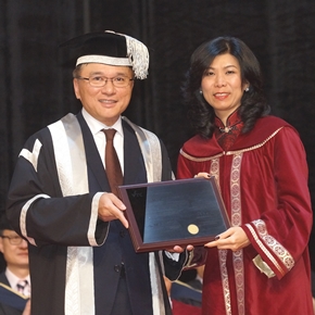 梅李玉霞女士於2016年度畢業典禮上獲財經事務及庫務局局長陳家強教授, GBS, JP頒授VTC榮譽院士榮銜