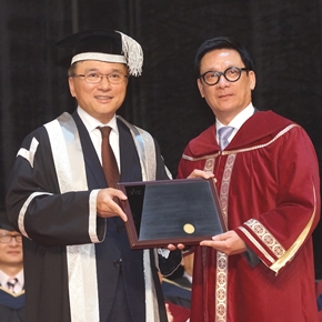 梁志天先生於2016年度畢業典禮上獲財經事務及庫務局局長陳家強教授, GBS, JP頒授VTC榮譽院士榮銜