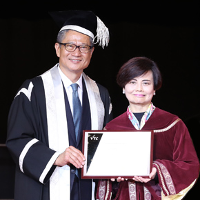 馬健生女士於2018年度畢業典禮上獲財政司司長陳茂波先生, GBM, GBS, MH, JP頒授VTC榮譽院士榮銜