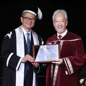 黃家和先生, BBS, JP於2018年度畢業典禮上獲財政司司長陳茂波先生, GBM, GBS, MH, JP頒授VTC榮譽院士榮銜
