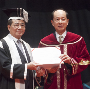 劉展灝先生, BBS, MH, JP於2012年度畢業典禮上獲教育局局長吳克儉先生, SBS, JP頒授VTC榮譽院士榮銜