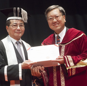 廖達賢先生於2012年度畢業典禮上獲教育局局長吳克儉先生, SBS, JP頒授VTC榮譽院士榮銜