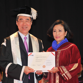 汪明荃博士, DLitt, SBS於2010年度畢業典禮上獲政務司司長唐英年先生, GBM, GBS, JP頒授VTC榮譽院士榮銜 |