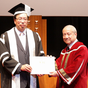何家鏗先生於2009年度畢業典禮上獲職業訓練局主席梁君彥先生, SBS, JP頒授VTC榮譽院士榮銜 |