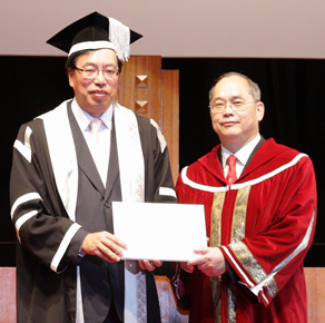 劉耀輝先生於2009年度畢業典禮上獲職業訓練局主席梁君彥先生, SBS, JP頒授VTC榮譽院士榮銜