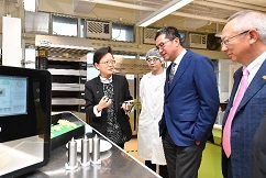 財經事務及庫務局局長劉怡翔(右二)到訪IVE(黃克競),參觀學院設施,並與學生交流,了解他們的學習情況及校園生活。
