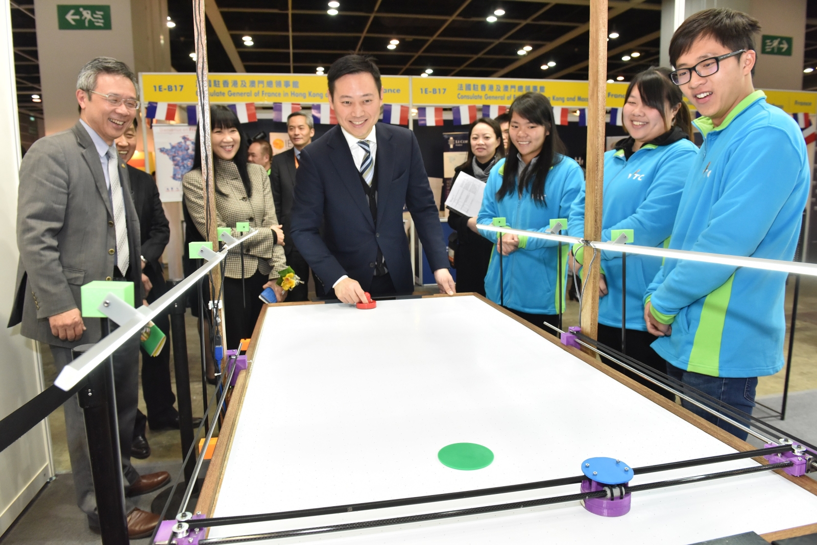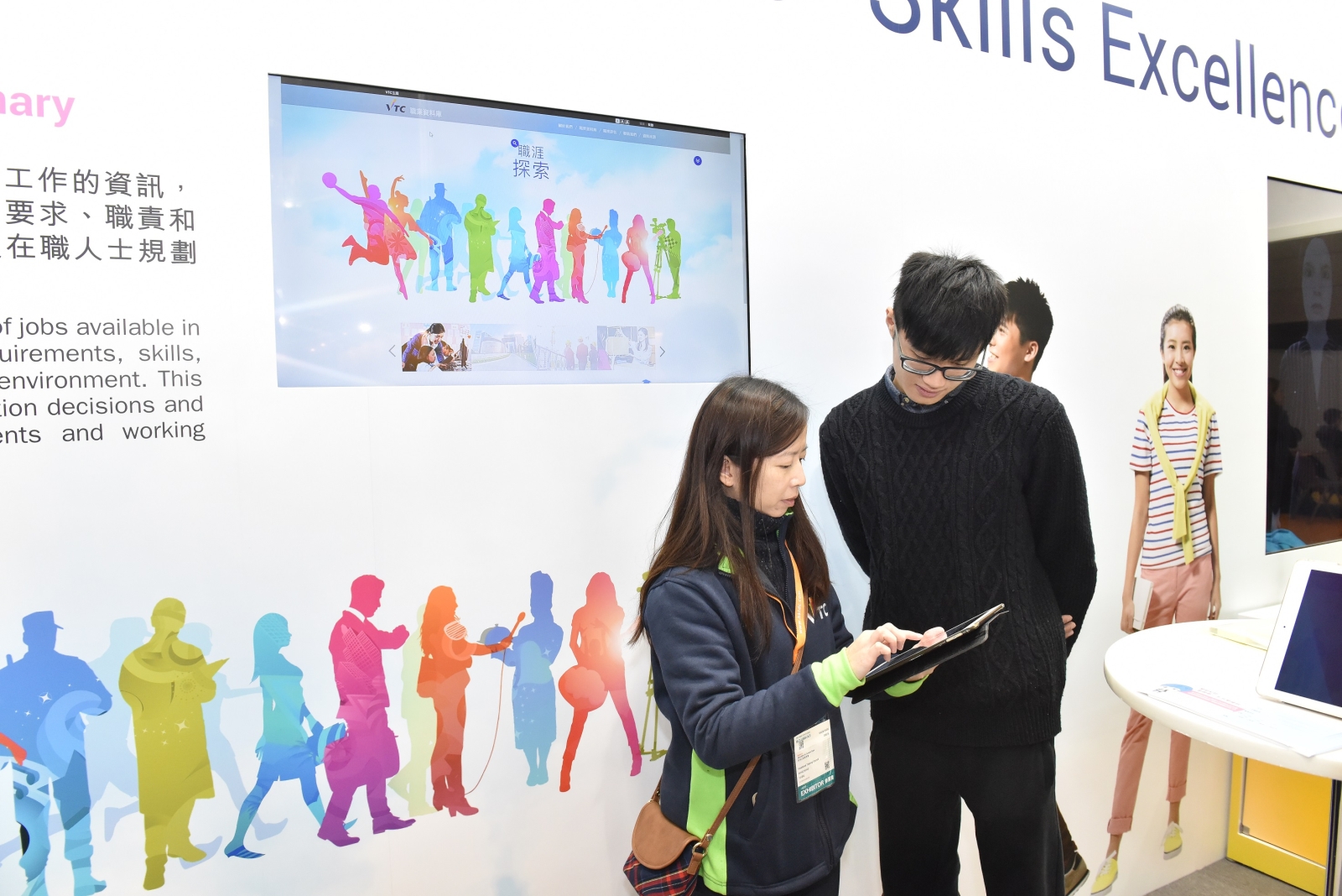 勞工及福利局副局長徐英偉為「教育及職業博覽」揭開序幕,並參觀VTC展台,與師生交流,了解職業專才教育的最新發展。今年VTC展台以「技能‧創未來」為主題,透過展出多項由VTC學生研發的創新科研成果、得獎項目及先進教學設施,顯示VTC推動跨學科發展,培育年輕一代成為21世紀知識與技能兼備的專才。同場特設「技能體驗區」,加強與公眾的互動,如與機械人作氣墊球比賽;測試應用於大型商場作顧客諮詢服務、運用人工智能(AI)最新技術的互動影像設備「Smily」。