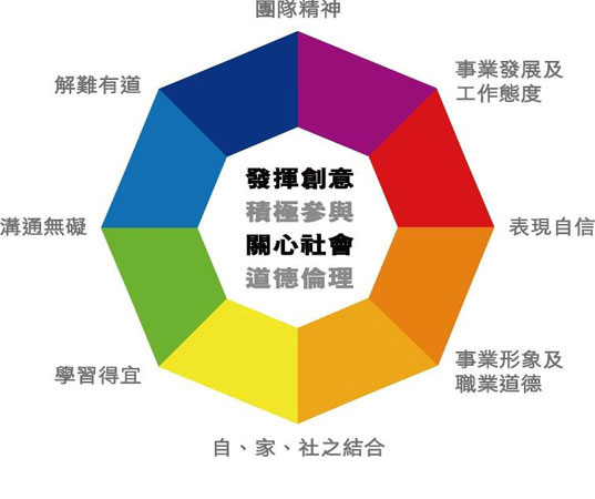 全人發展課程涵蓋8大範疇,包括︰ 1. 團隊精神 2. 解難有道 3. 溝通無礙 4. 學習得宜 5. 自、家、社之結合 6. 事業形象與職業道德 7. 表現自信 8. 事業發展及工作態度
